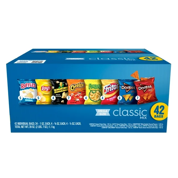 - Frito Lay Mega Size Classic Mix includes 42 single serve snack bags